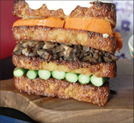5. Turn the broiler on and make sure your rack is low enough that the stack has room to sit under the broiler. On a baking pan lined with foil, place one slice of kugel. Top that with a row of sliced asparagus or green beans. Top that with another piece of kugel and a spoonful of mushroom duxelles (or a piece of brisket). Top with another slice of kugel and add a spoonful of tsimmes or a slice of sweet potato. Top with a final piece of potato kugel and add a slice of mozzarella. Leave the cheese off if you are using brisket.
