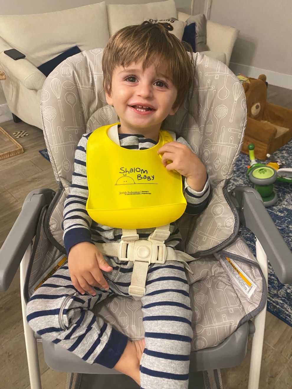 There are so many elements to building a strong and vibrant Jewish community… and I think it is safe to say that one of the major ingredients that go into growing Jewishly is instilling a sound Jewish beginning. With all the distractions of our busy lives, it may be easy to forget that sharing a love for Judaism with our children is one of the most beautiful and everlasting gifts we can provide them. Pictured here is Chai Barker — the first (and only) grandchild of my wife Debbi and me — wearing his Shalom Baby bib. I don’t know if Chai is so happy because of his stylish new bib or because he knows that food is about to be served! But I do know that when we give to the annual campaign and welcome babies like Chai our future is bright!