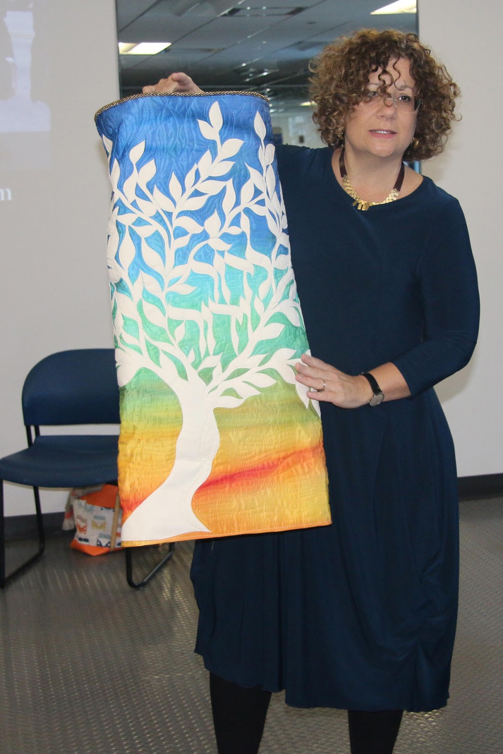 World-renowned Judaic artist Jeanette Kuvin Oren shows off a Torah cover she created. Kuvin Oren stopped by the Jewish High School of Connecticut recently to speak to students about following their passions and just how far that can take them.