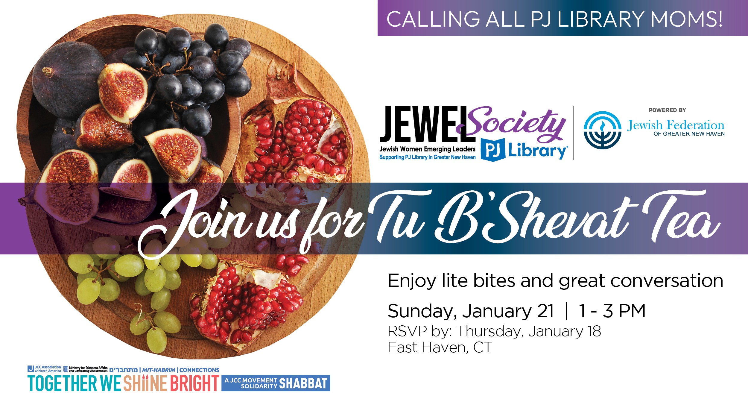 Calling all moms of PJ Library kiddos! Members and potential new members are invited to join us for a JEWEL Society Tu B'Shevat Tea. This will be your opportunity to connect with each other, learn about and help shape the goals and mission of this new initiative that supports PJ Library in Greater New Haven. Enjoy tea, coffee, lite bites and great conversation. This event is intended for moms raising Jewish kids under the age of 12.